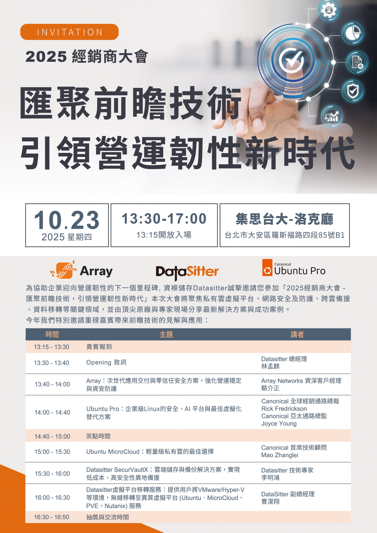 本次活動將聚焦於私有雲虛擬平台、零信任、跨域資料管理、備援與移轉加值服務等領域,邀請Ubuntu、Array、Hammerspace、Datasitter專家現場分享最新應用案例與解決方案